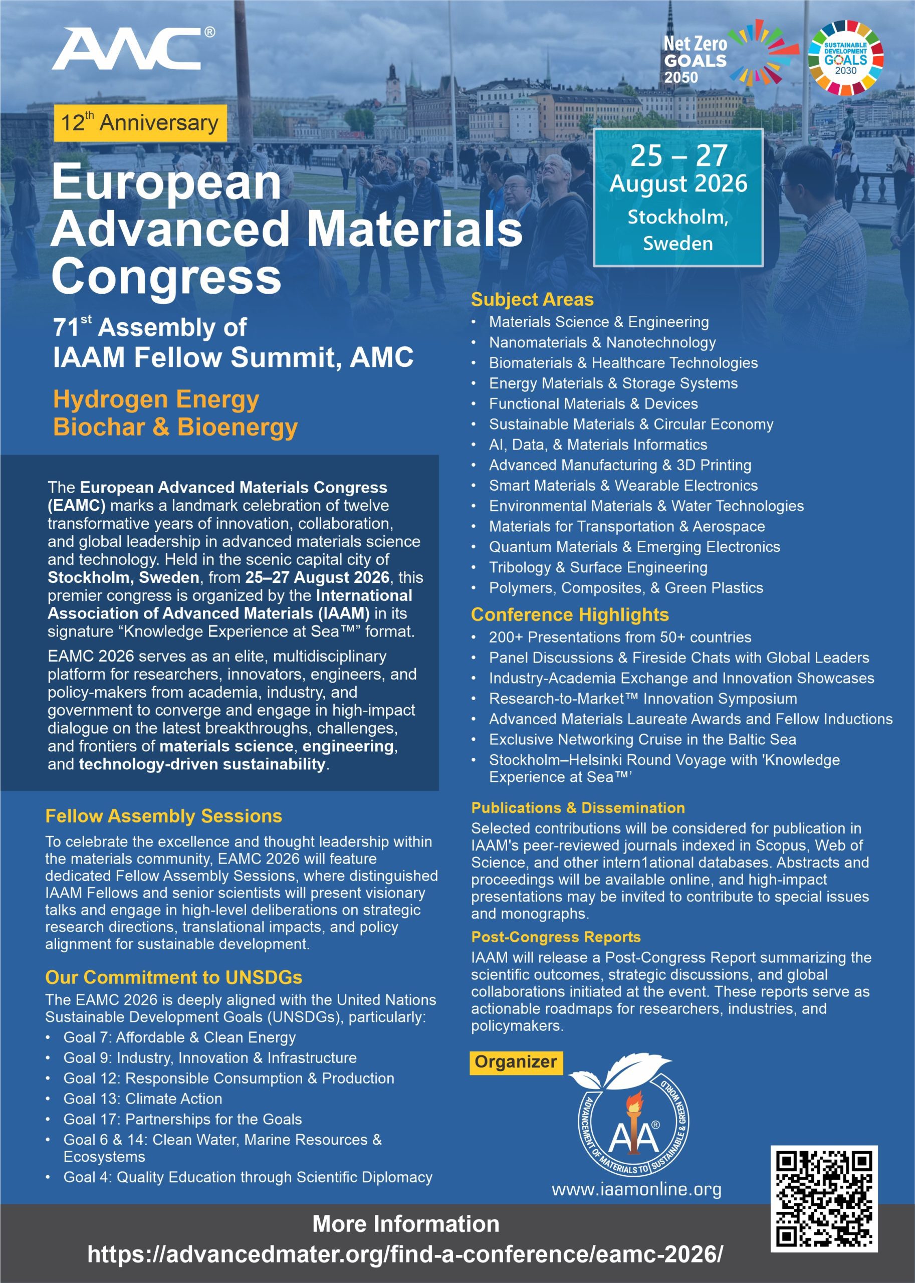 The European Advanced Materials Congress (EAMC) marks a landmark celebration of twelve transformative years of innovation, collaboration, and global leadership in advanced materials science and technology. Held in the scenic capital city of Stockholm, Sweden, from 25–27 August 2026, this premier congress is organized by the International Association of Advanced Materials (IAAM) in its signature “Knowledge Experience at Sea™” format.