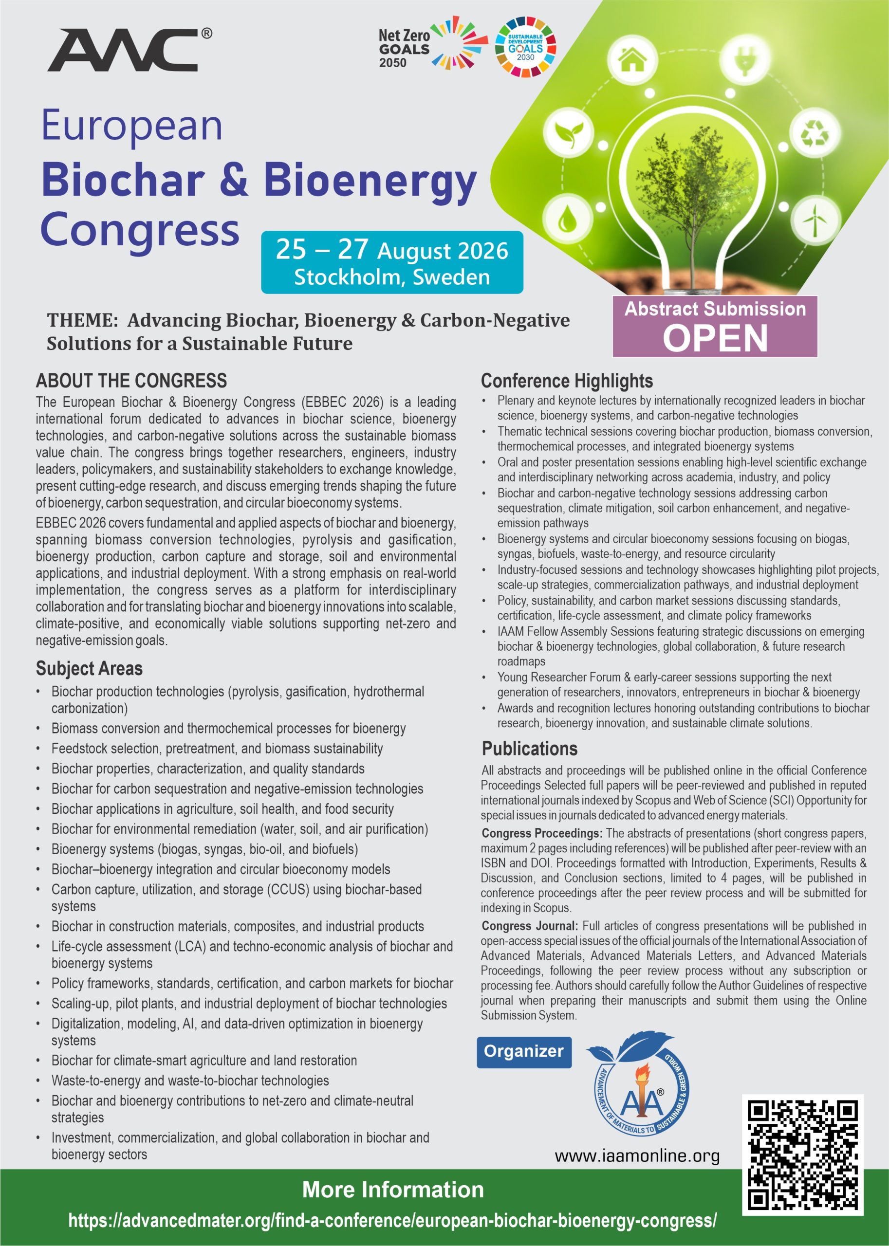 The European Biochar & Bioenergy Congress (EBBEC 2026) is a leading international forum dedicated to advances in biochar science, bioenergy technologies, and carbon-negative solutions across the sustainable biomass value chain. The congress brings together researchers, engineers, industry leaders, policymakers, and sustainability stakeholders to exchange knowledge, present cutting-edge research, and discuss emerging trends shaping the future of bioenergy, carbon sequestration, and circular bioeconomy systems.