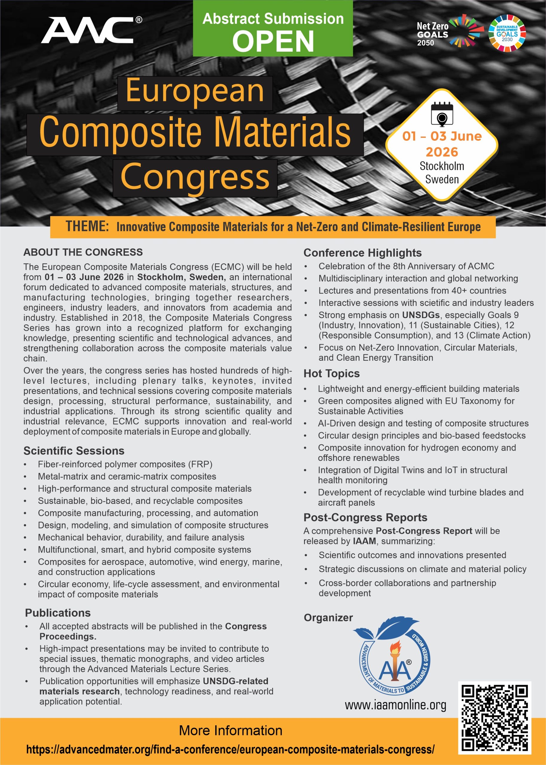 In alignment with the United Nations Sustainable Development Goals (UNSDGs), the European Composite Materials Congress (ECMC) 2026 is committed to advancing sustainable materials innovation and responsible industrial development through the following goals: