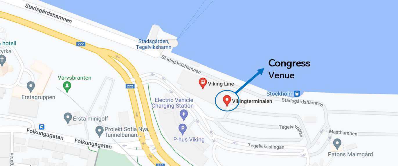The main airport, Stockholm Arlanda Airport (IATA: ARN, ICAO: ESSA), is located approximately 50 kilometers from the congress venue at Värtaterminalen.
