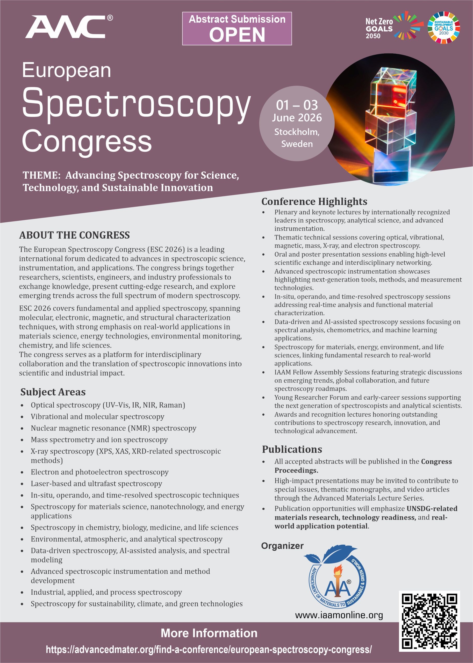 ESC 2026 covers fundamental and applied spectroscopy, spanning molecular, electronic, magnetic, and structural characterization techniques, with strong emphasis on real-world applications in materials science, energy technologies, environmental monitoring, chemistry, and life sciences. The congress serves as a platform for interdisciplinary collaboration and the translation of spectroscopic innovations into scientific and industrial impact.